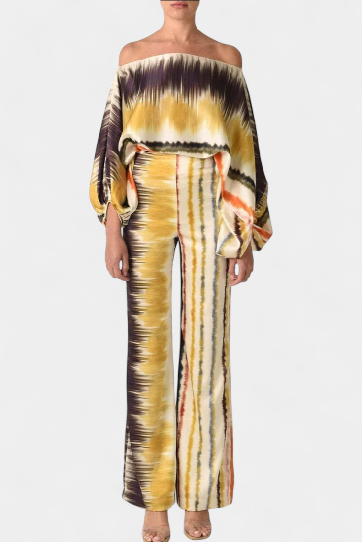 El conjunto Sybella combina una blusa con hombros descubiertos y mangas de farol con pantalones de pierna ancha y estampado artístico. Diseñado para ofrecer una silueta fluida con personalidad, es perfecto para días soleados, escapadas relajadas o encuentros con estilo.